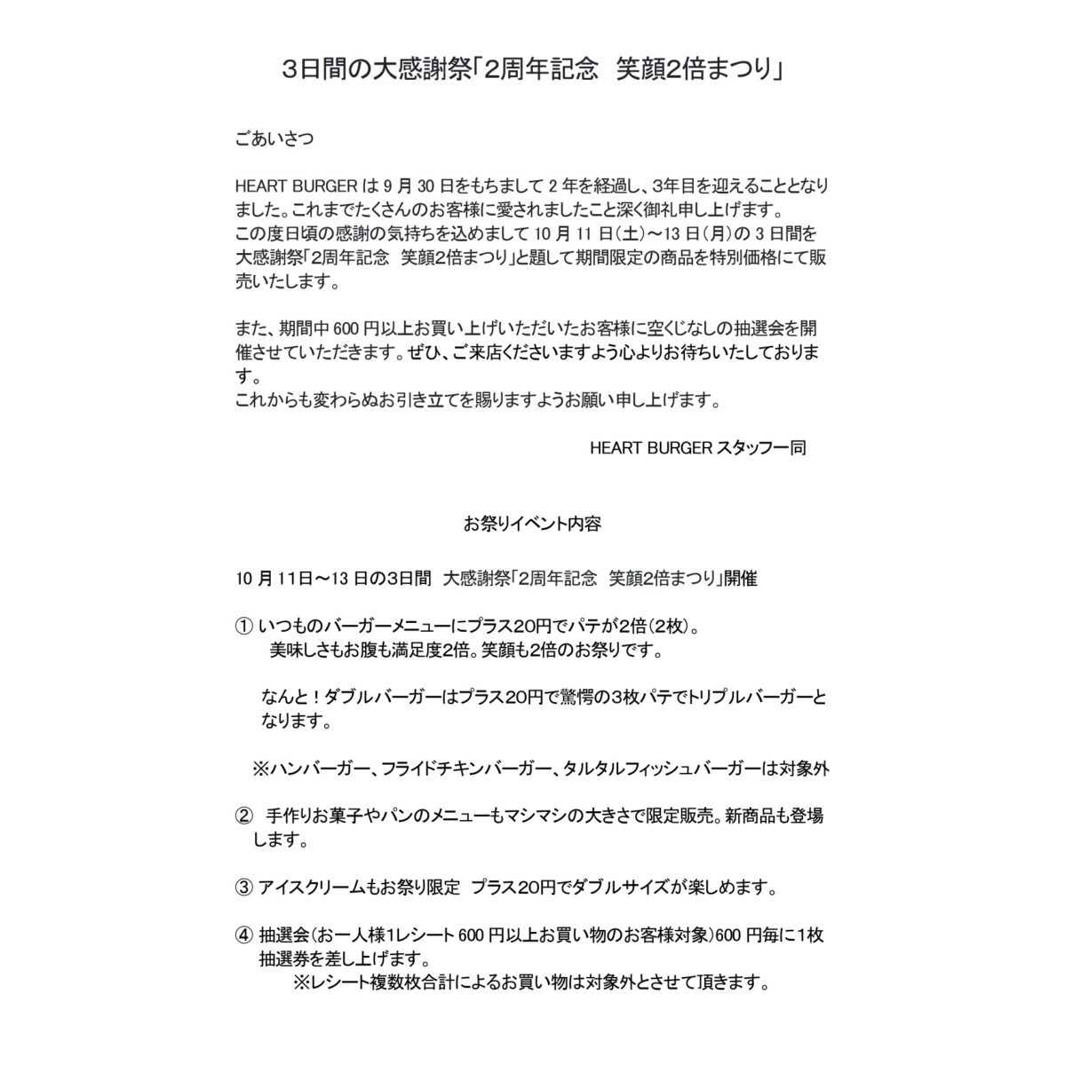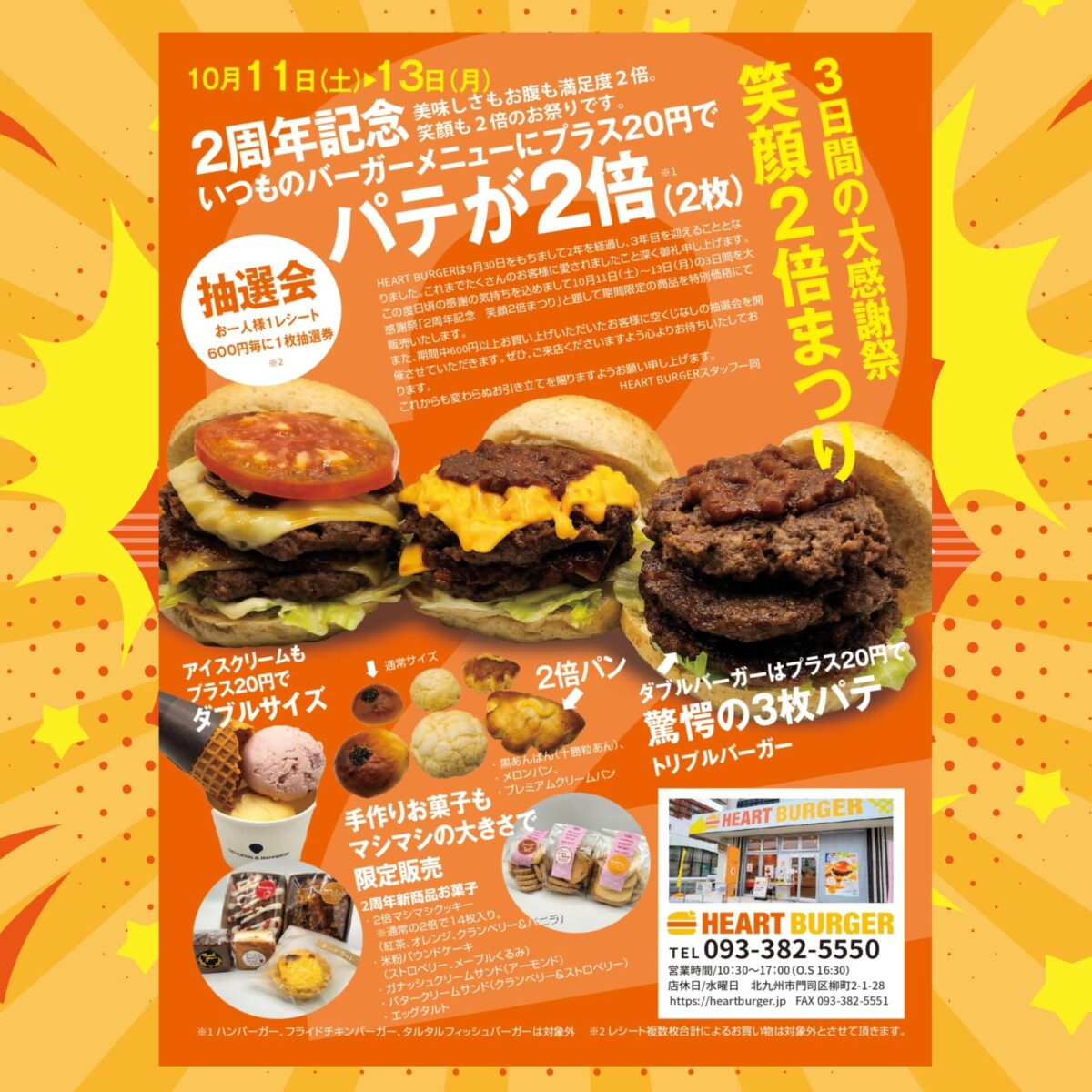 【HEART BURGER】3日間の大感謝祭「2周年記念 笑顔2倍まつり」のご案内