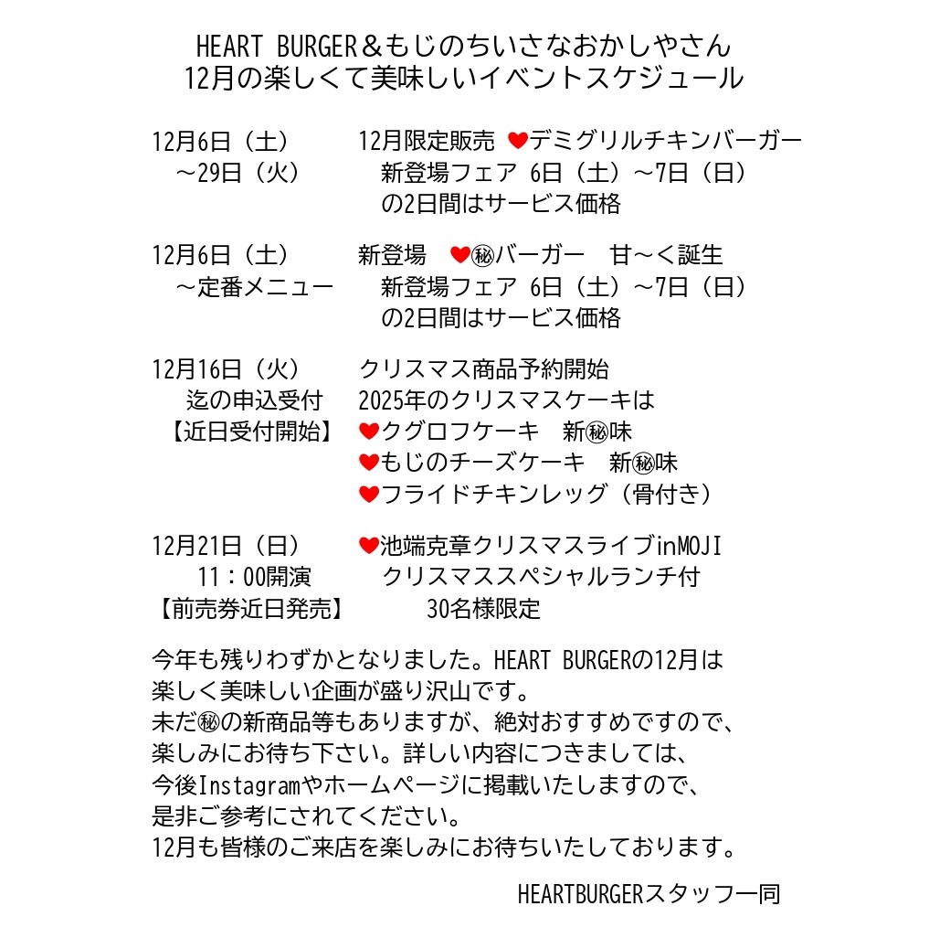 今年も残りわずかとなりました。HEART BURGERの12月は楽しく美味しい企画が盛り沢山です。未だ㊙の新商品等もありますが、絶対おすすめですので、楽しみにお待ち下さい。